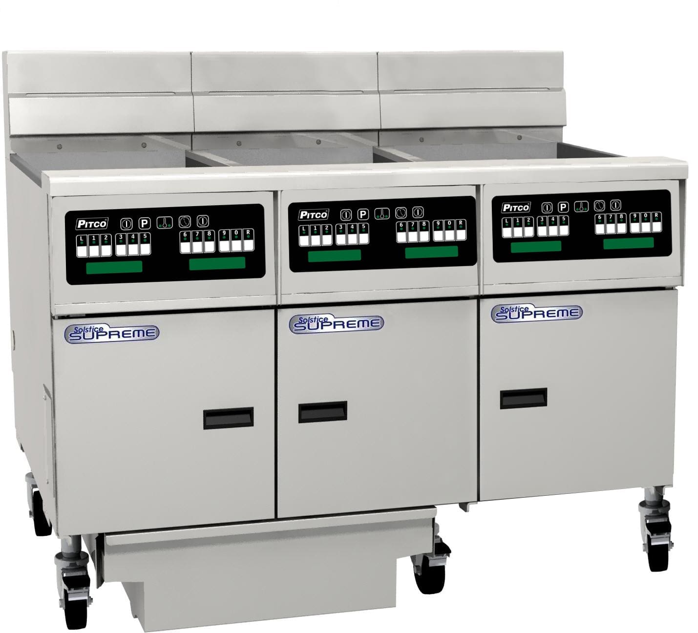 computer control, filter drawer on castors, 3 bank fryer, 2 baskets per tank, 22L oil capacity per tank, lid, filter drawer on castors, flush hose, 9” swivel castors with front brakes